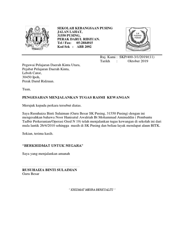 Contoh surat penurunan kuasa ap11. Contoh Surat Perakuan Menajalan Tugas Kewangan Sekolah. Kewangan Menajalan Sekolah wallpaper.